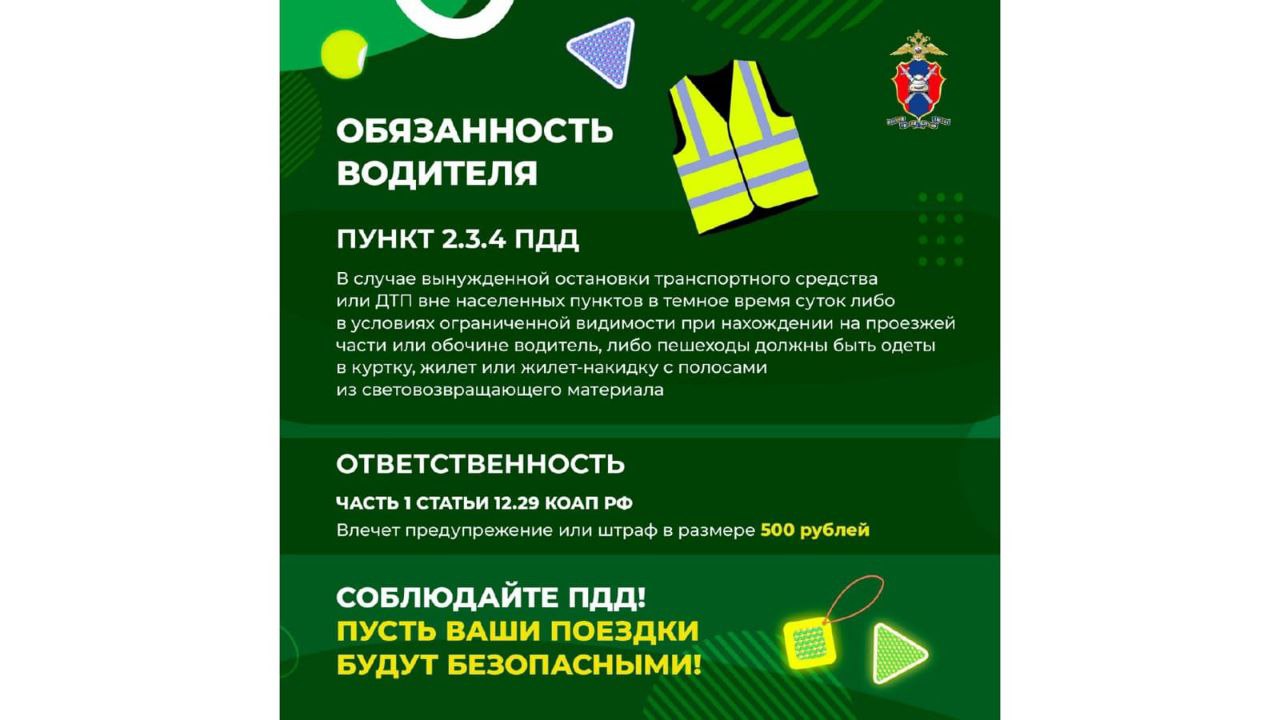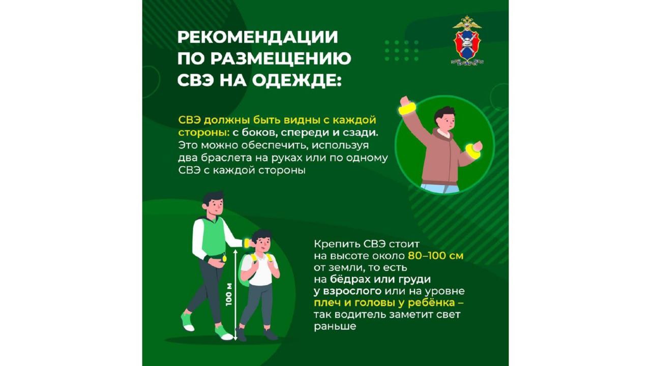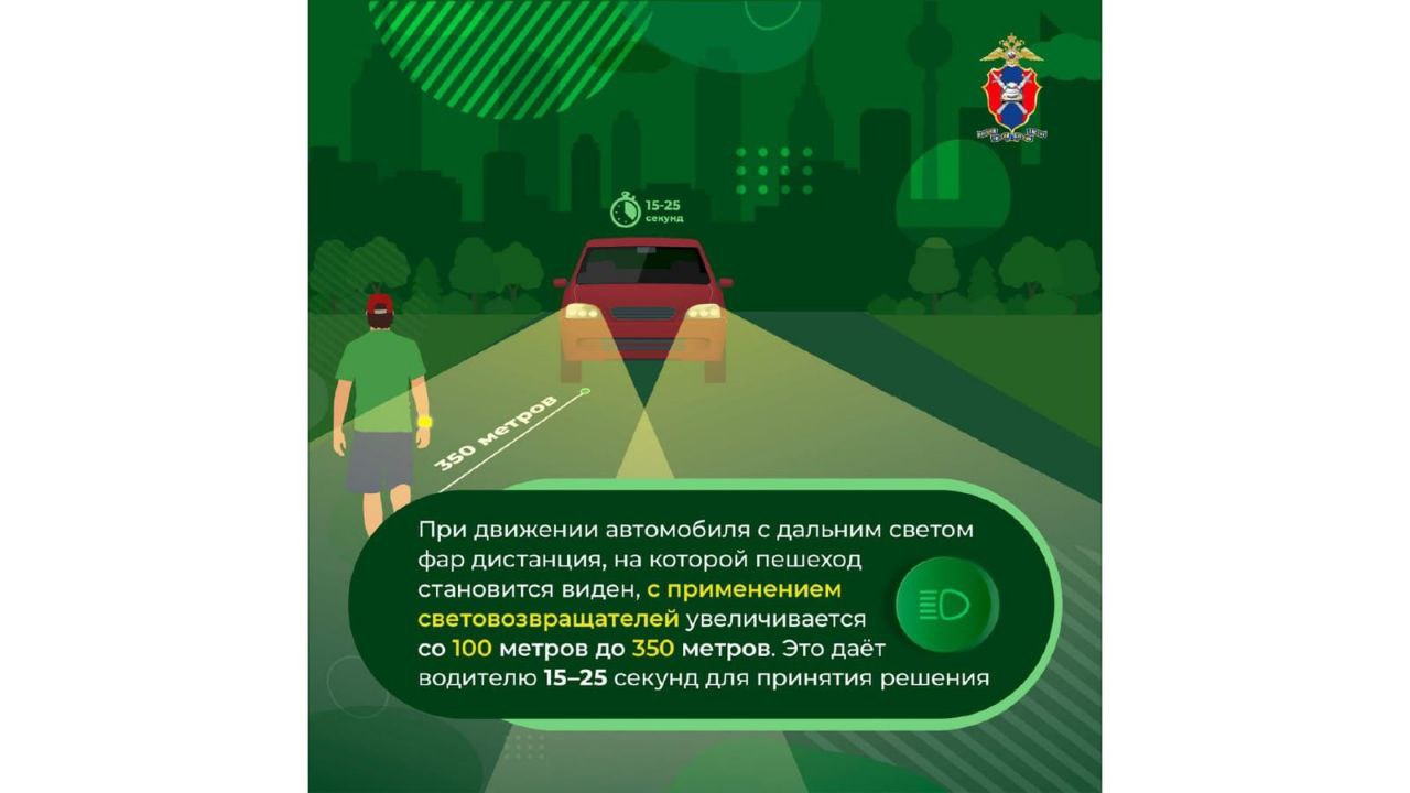 В темное время суток водители очень часто не видят на дороге пешеходов, особенно детей, из-за чего происходят многочисленные происшествия с тяжелыми последствиями. Госавтоинспекция рекомендует родителям обеспечить ребёнка световозвращательным элементом, а затем контролировать их ношение, вне зависимости от времени суток и времени года. При наличии световозвращающих элементов водитель увидит пешехода на расстоянии 100-150 метров при ближнем свете фар и до 300 метров – при дальнем.